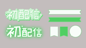 ダークグリーン、緑の背景と合わせて使える、初配信の文字とパーツの飾り素材です。サムネイルや配信画面に便利。好きな文字を書き込んで使えます。