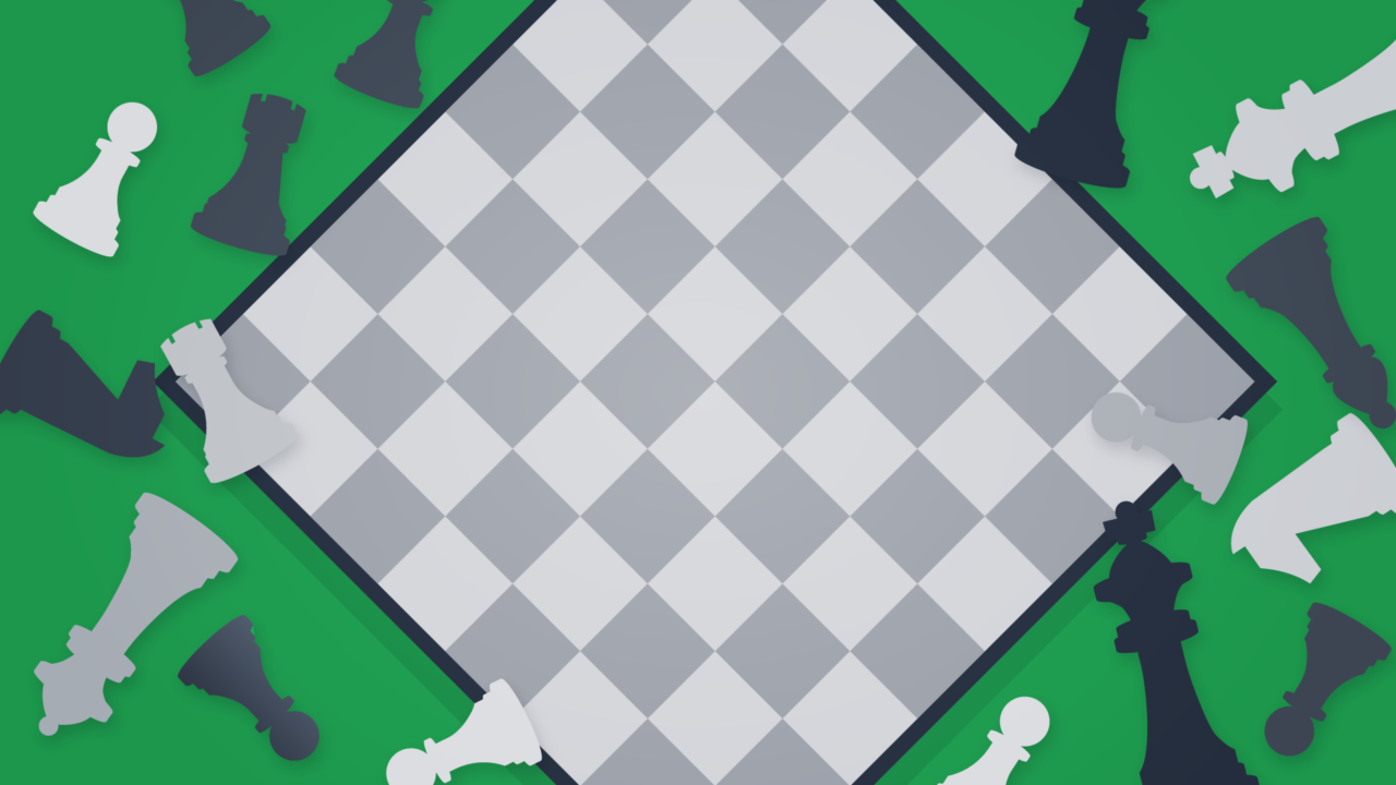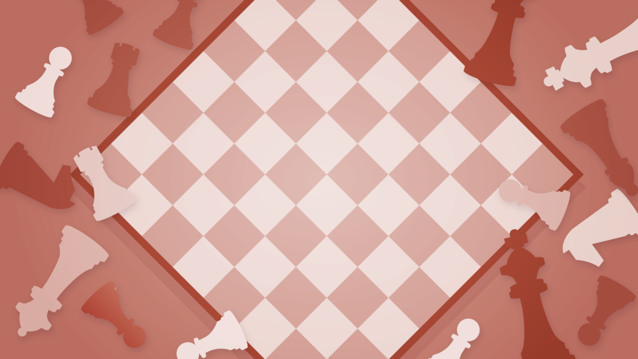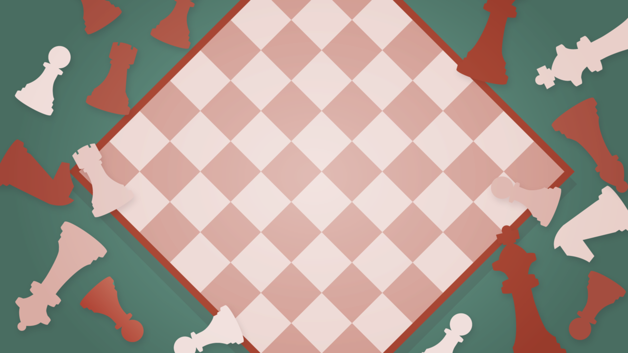 チェス盤の上にチェスのコマが散らばったイラスト。