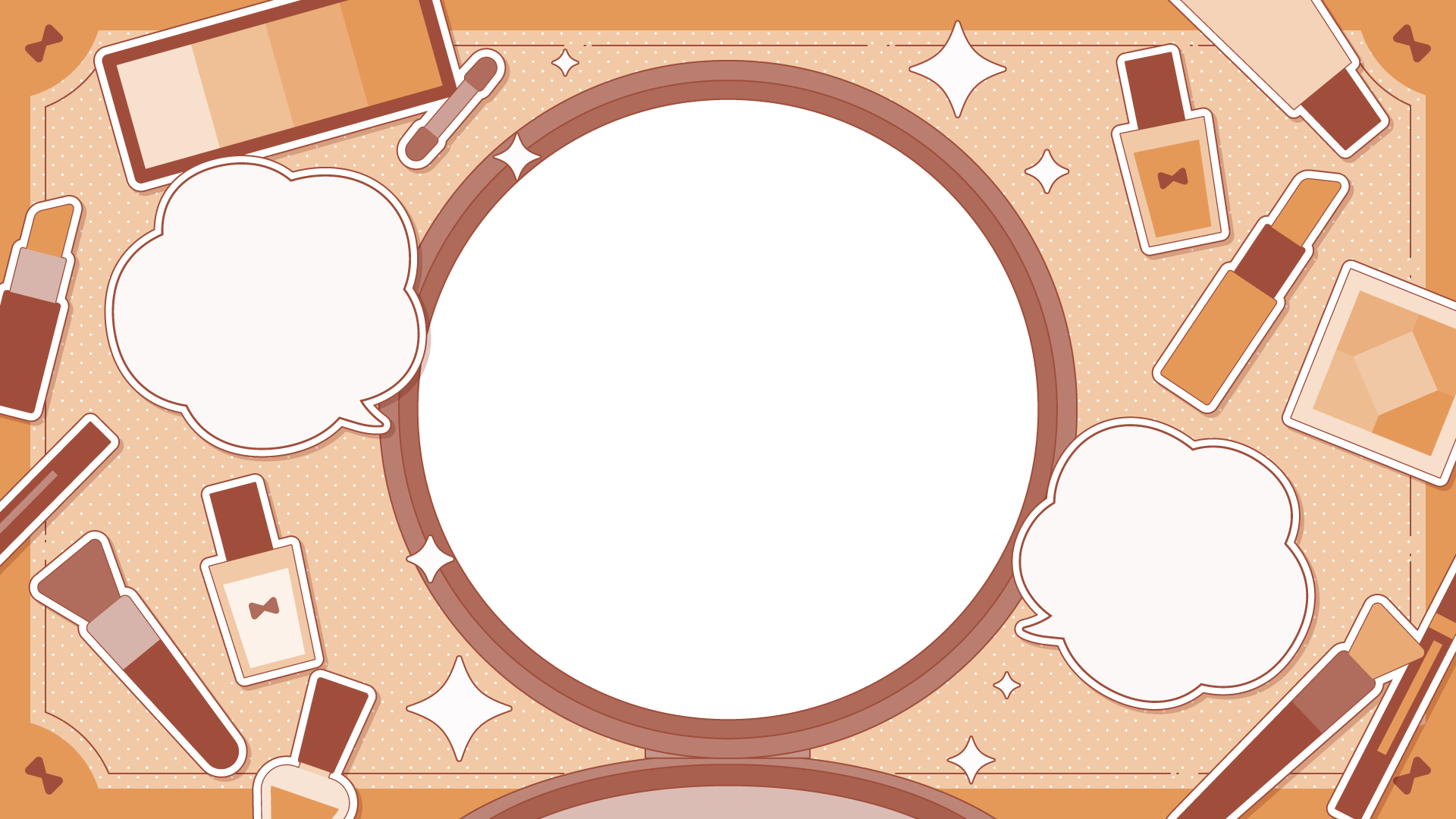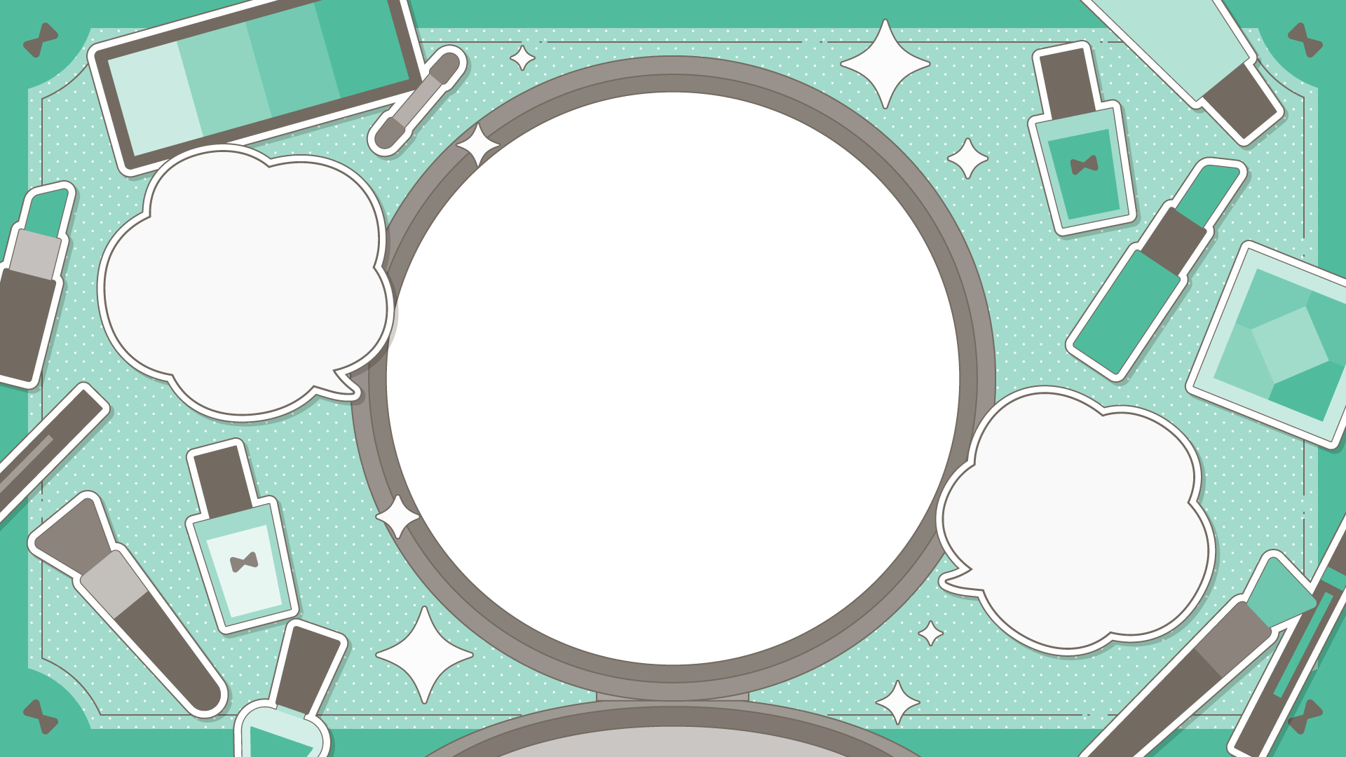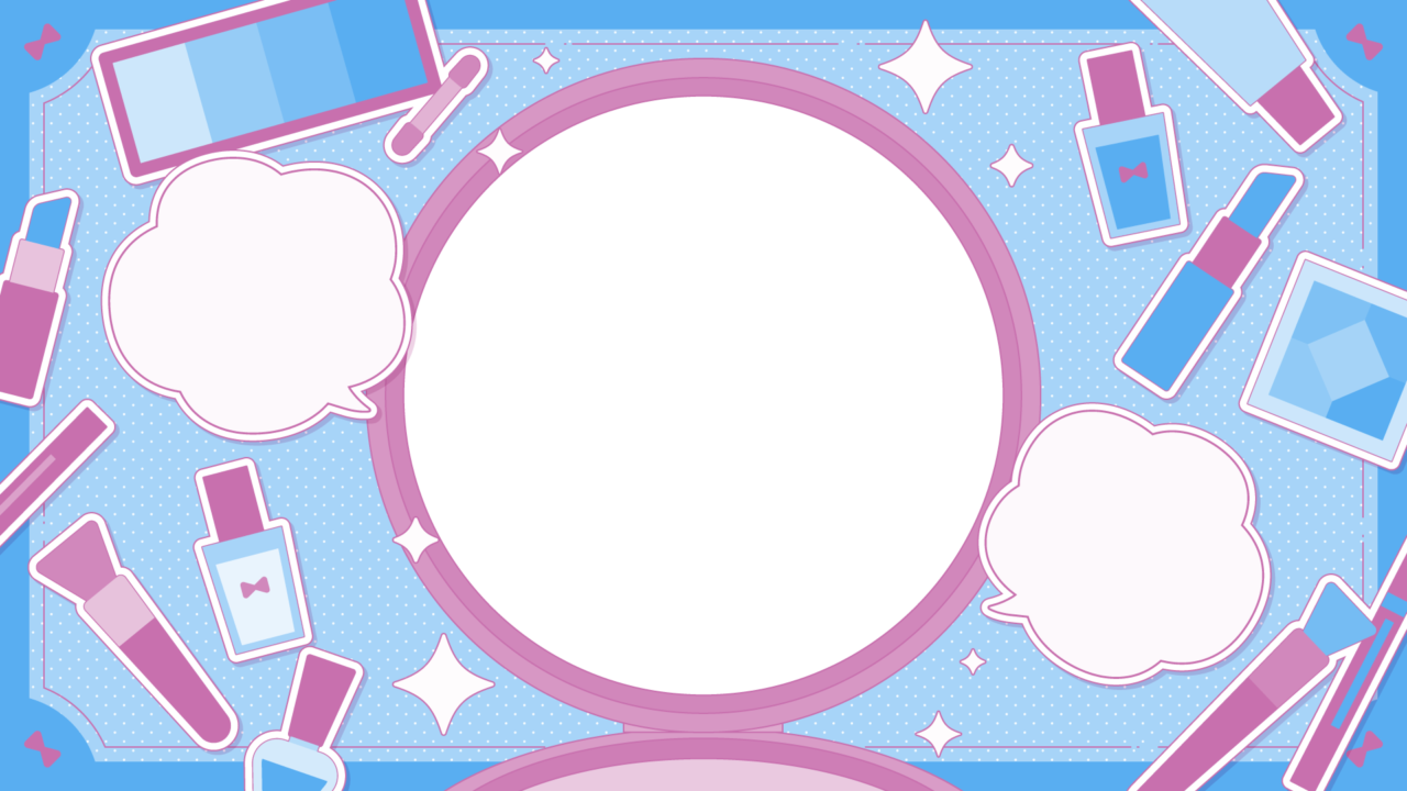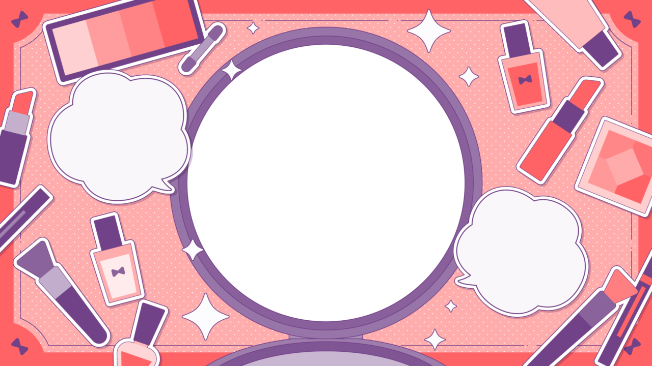 メイク道具の散らばるテンプレート素材です。コンパクトの部分に写真やイラストを入れてサムネイルなどに。