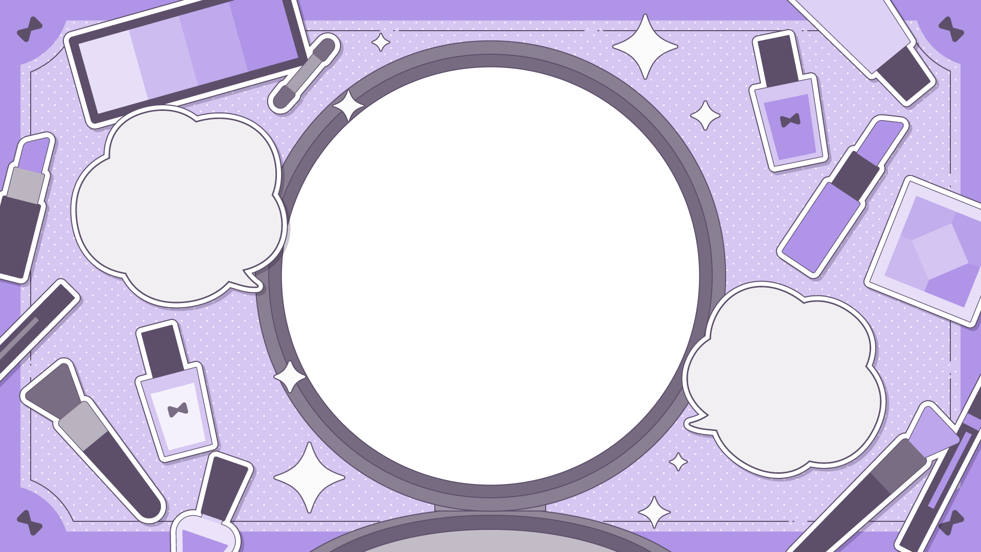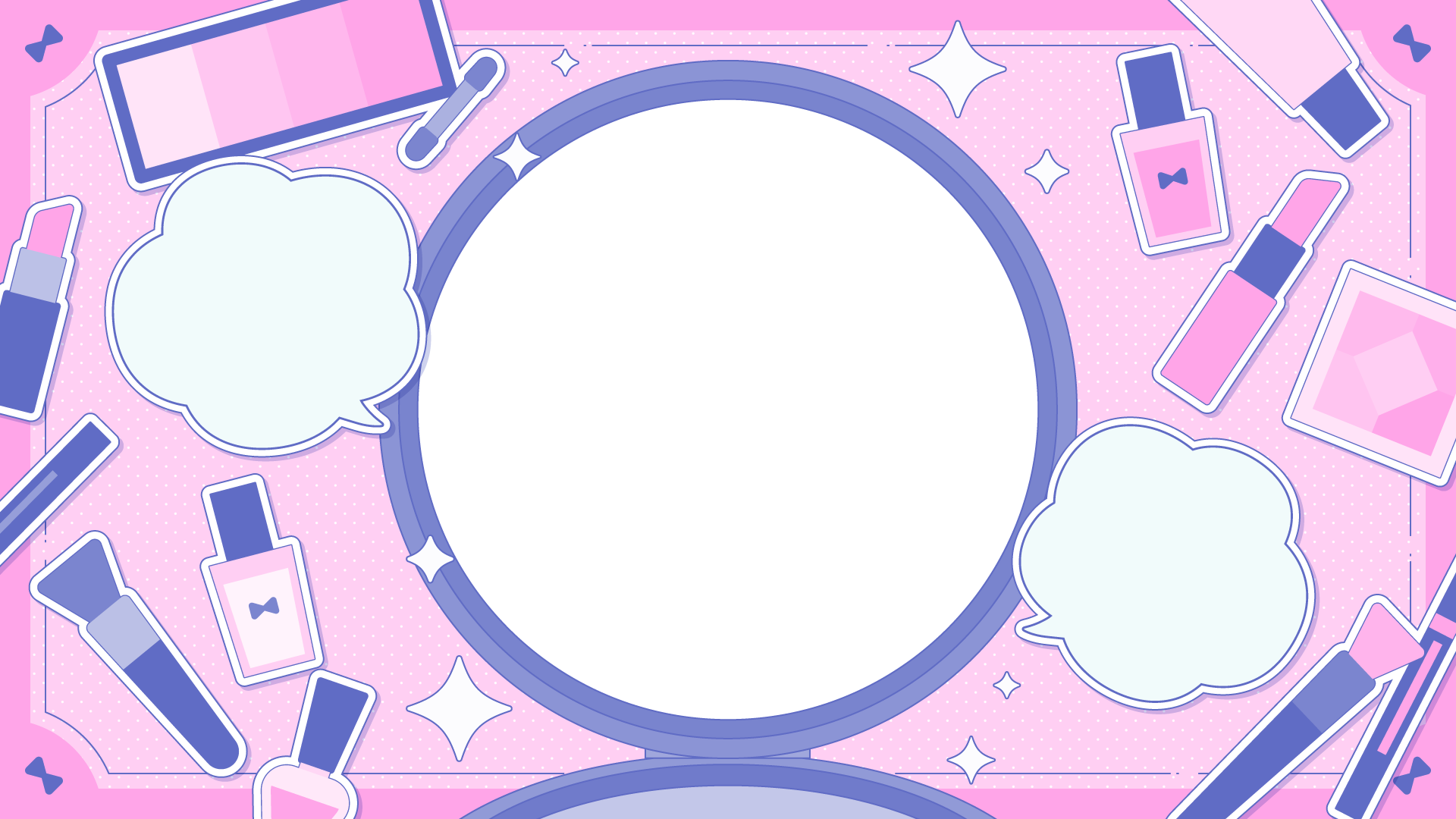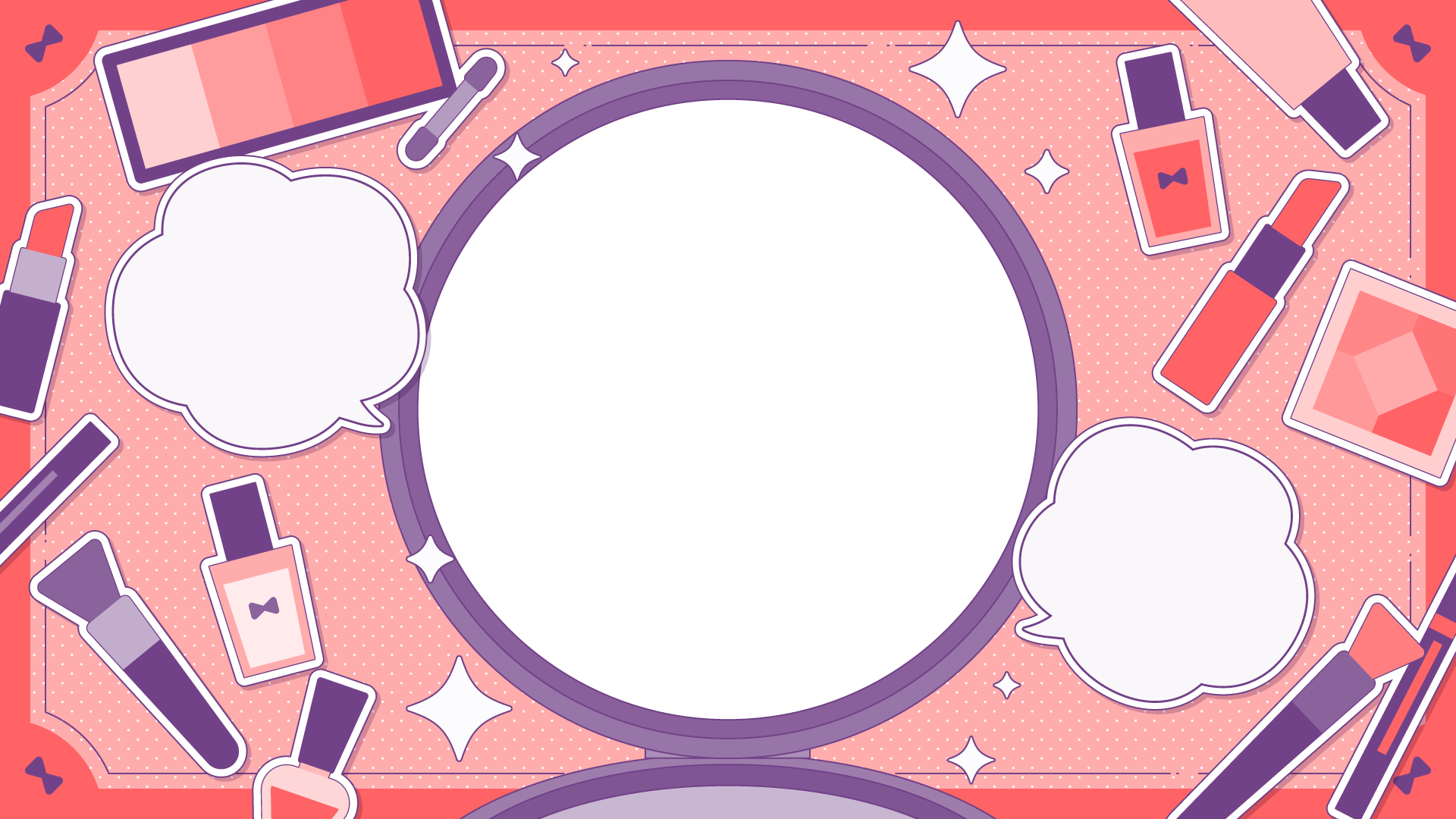 メイク道具の散らばるテンプレート素材です。コンパクトの部分に写真やイラストを入れてサムネイルなどに。