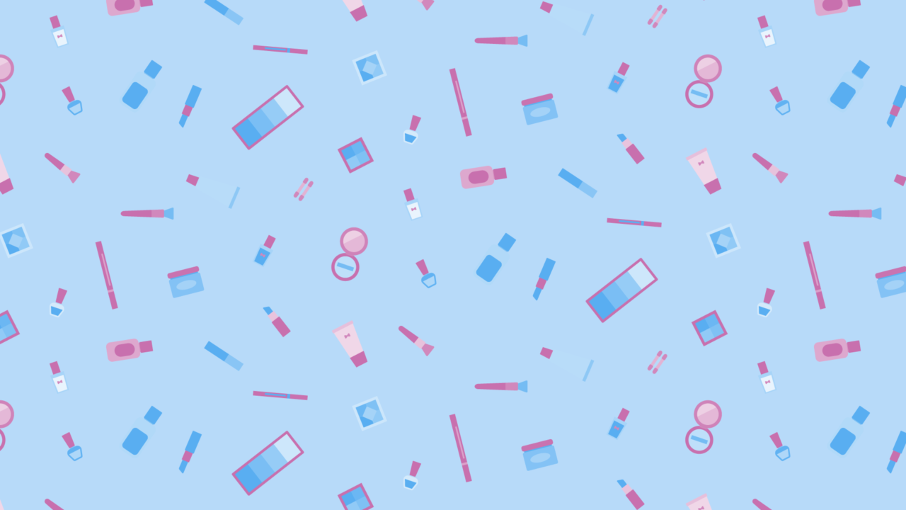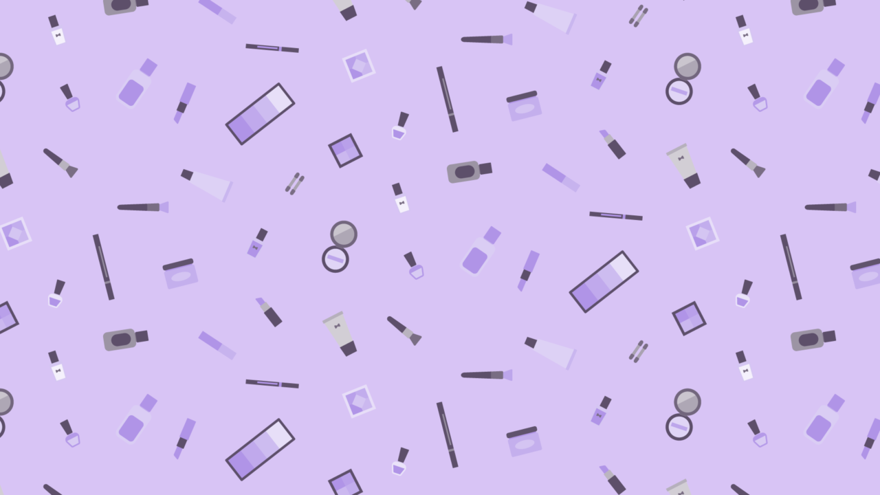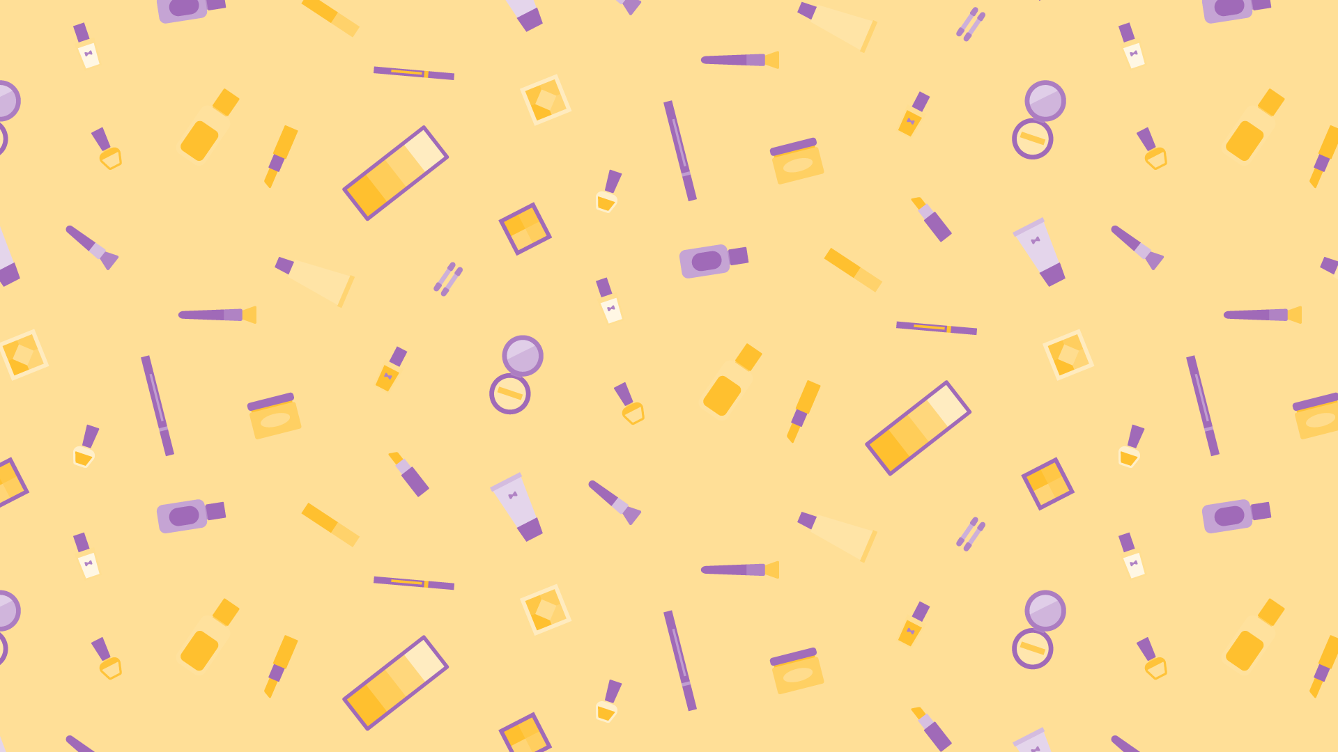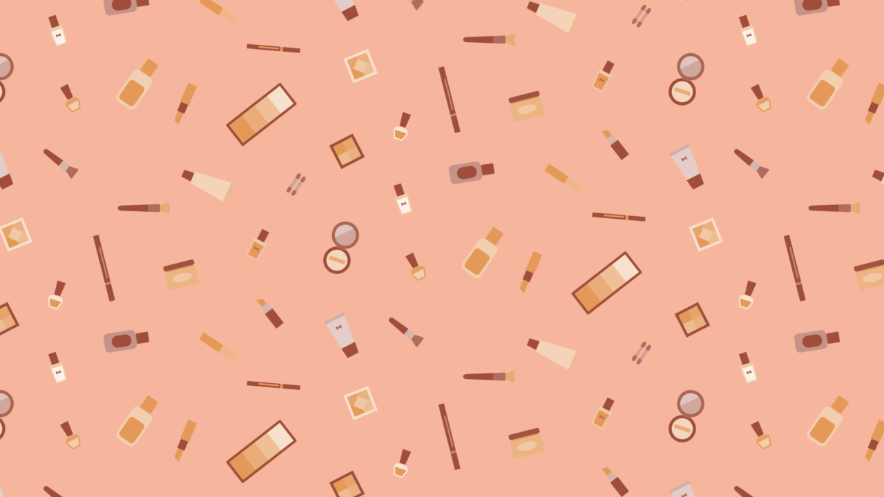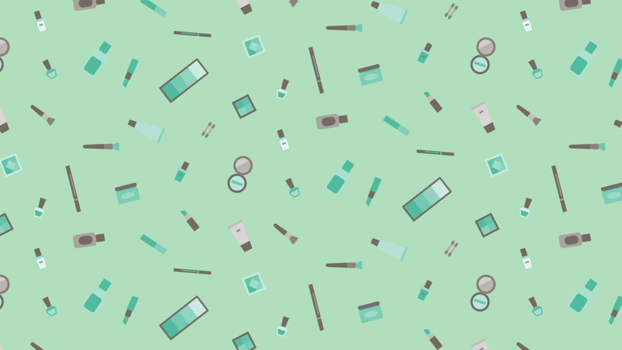 メイク道具の散らばるデザインイラスト素材です。ネイルやリップ、ブラシ、パレットなどいろいろ。