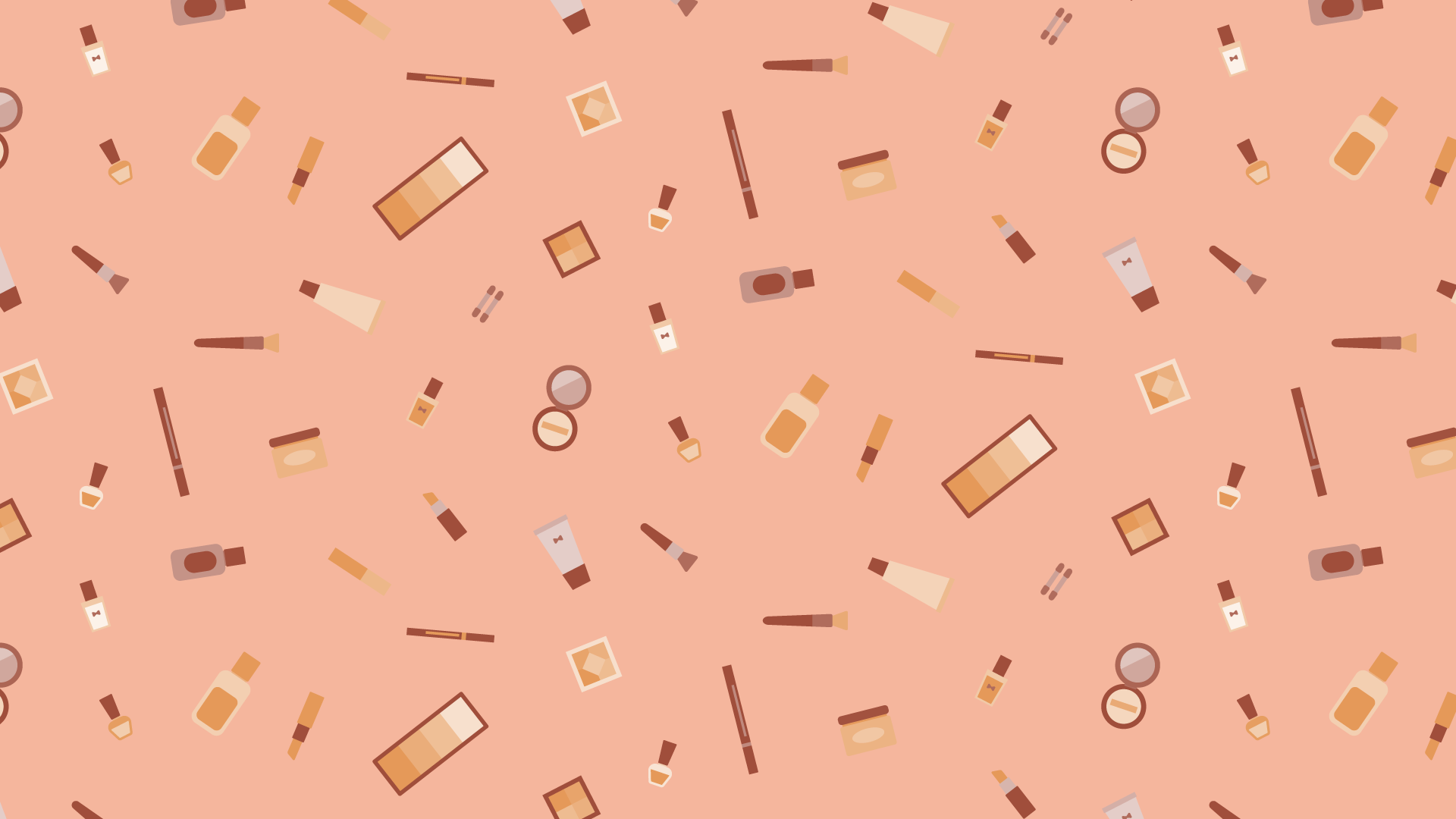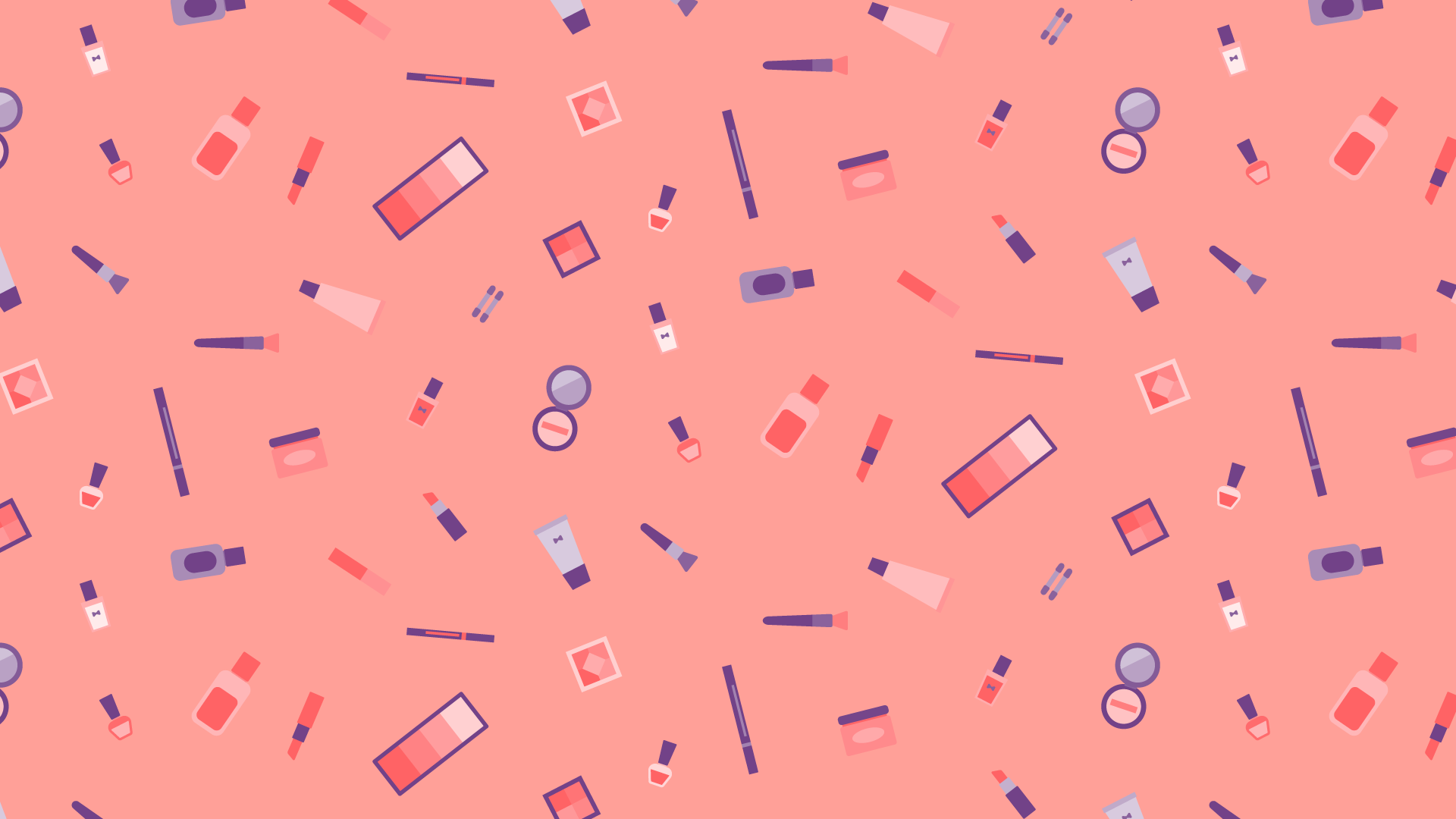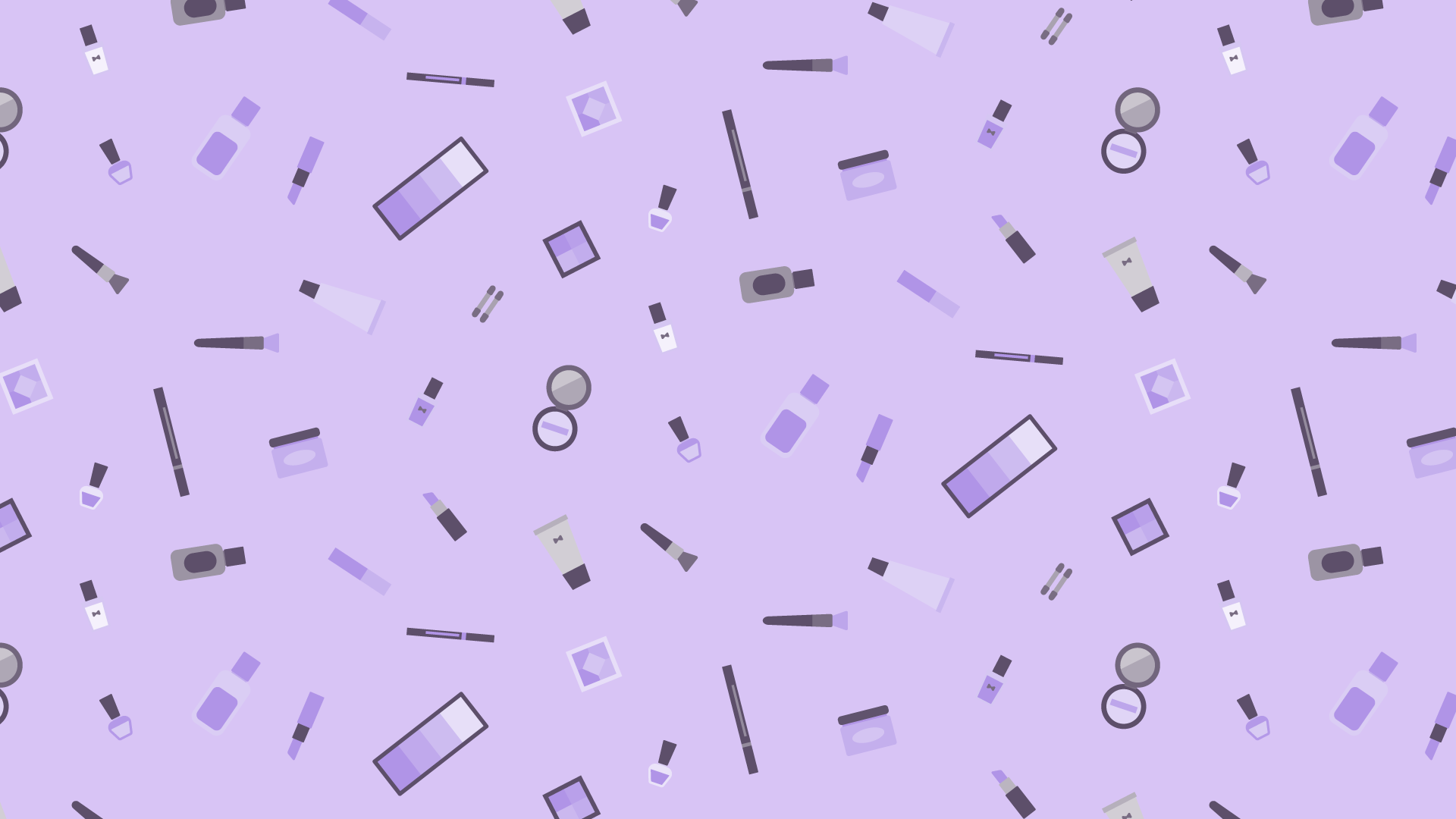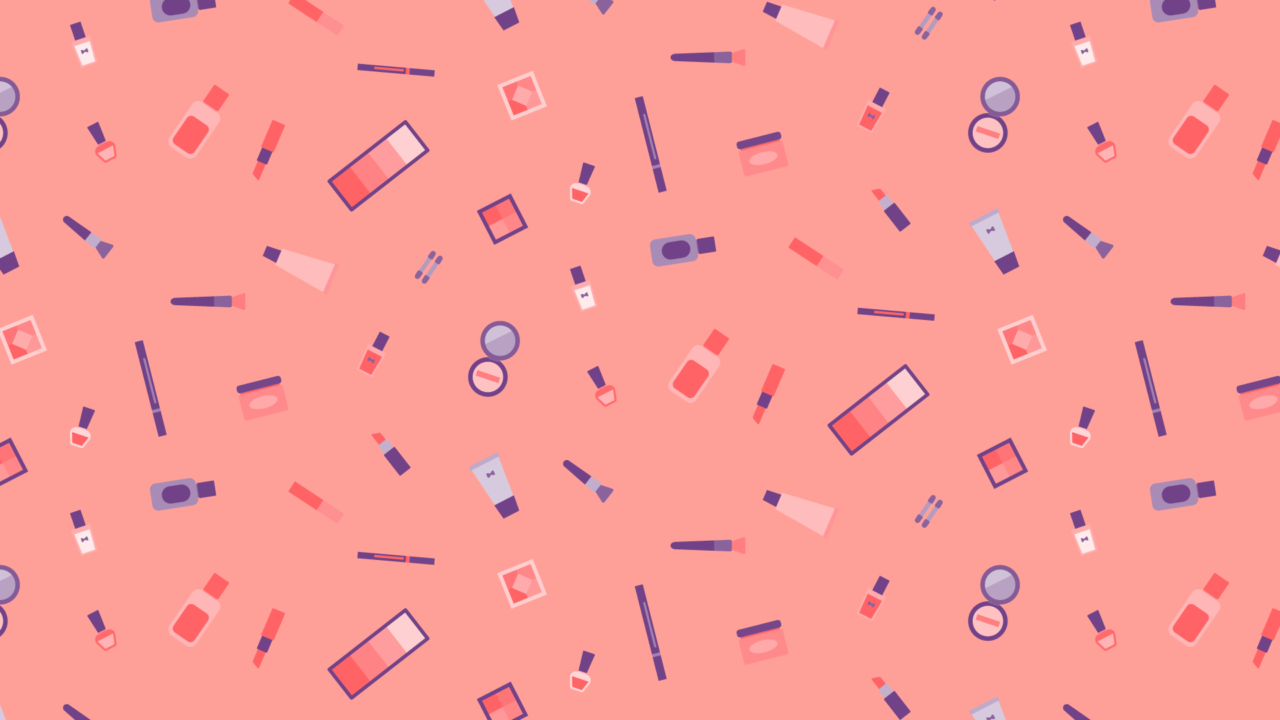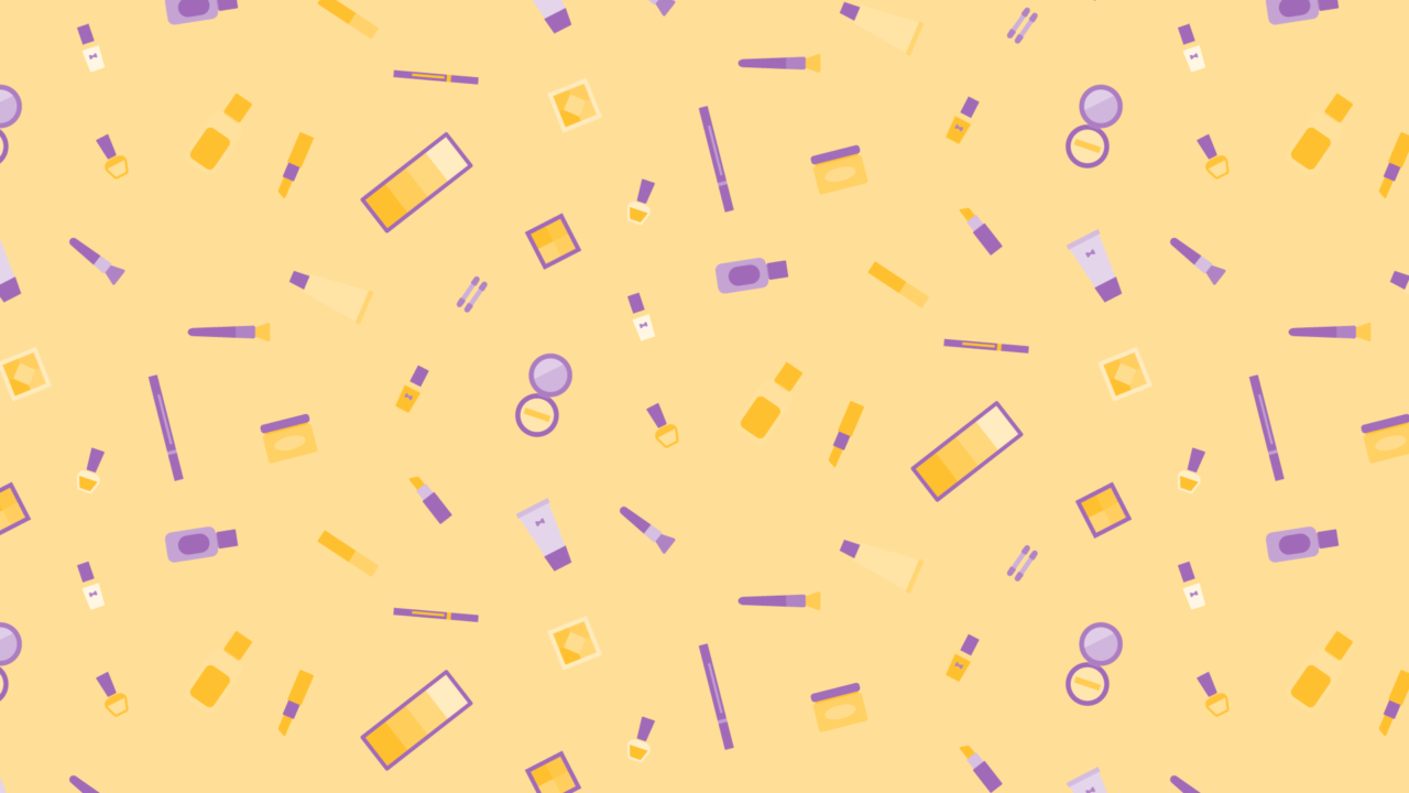 メイク道具の散らばるデザインイラスト素材です。ネイルやリップ、ブラシ、パレットなどいろいろ。
