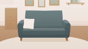シンプル、ナチュラルなリビングルームの背景素材です。ソファとカーペット、棚と額縁。男女問わず使いやすいデザイン。昼・夜とそれぞれのぼかしバージョン。雑談、コ...