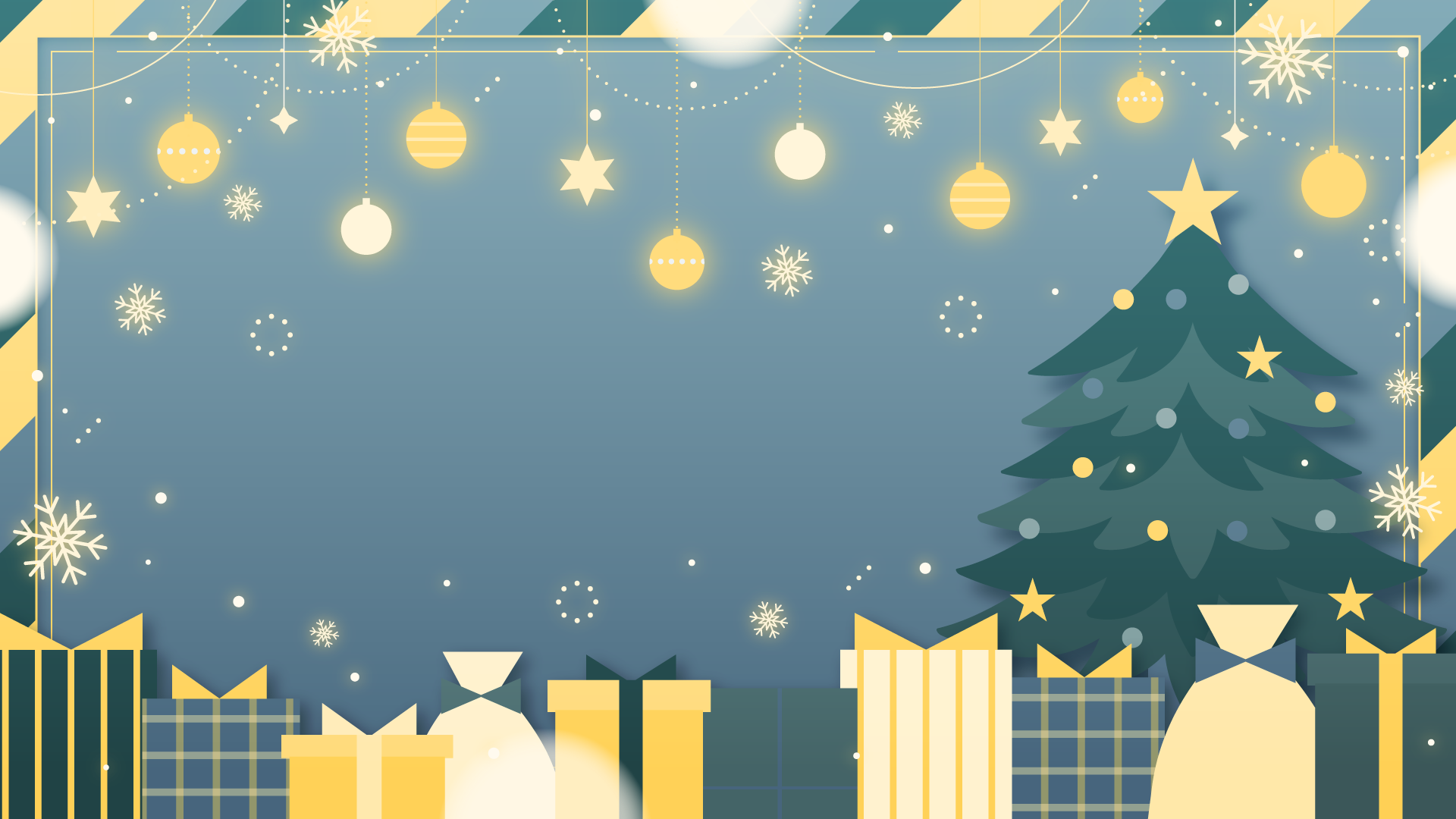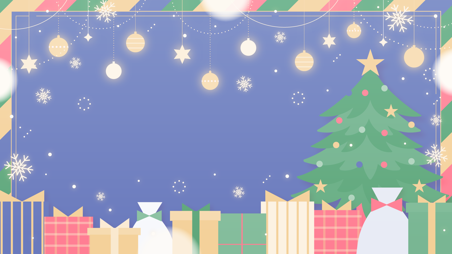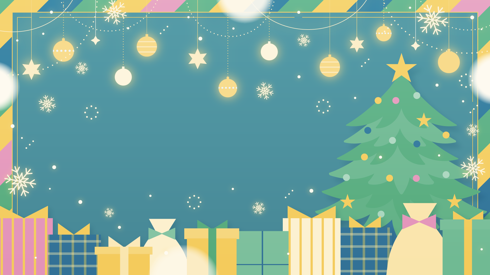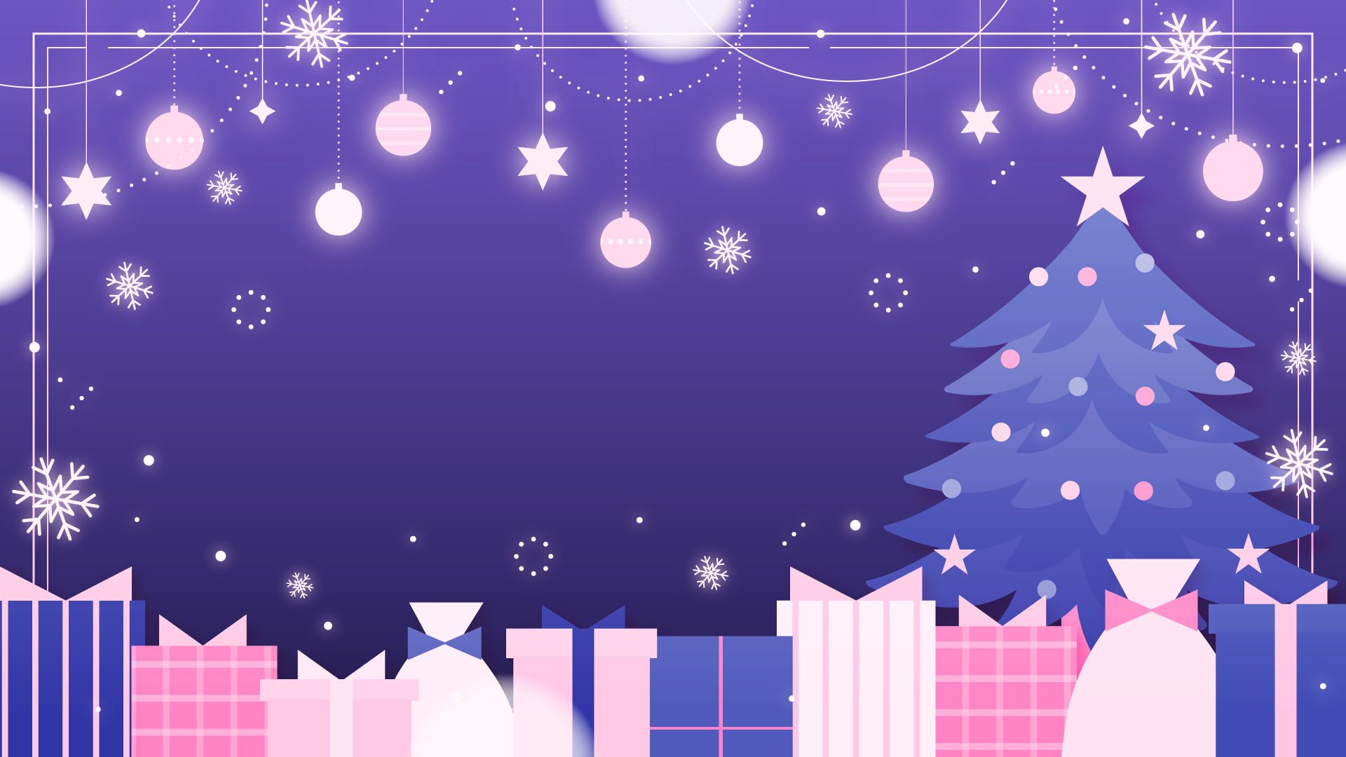 オーナメントとクリスマスツリー、プレゼント、雪の結晶なイラスト背景素材です。