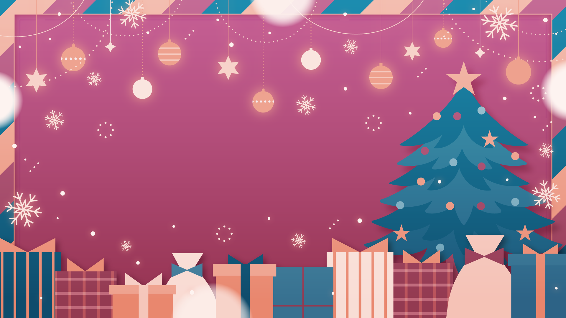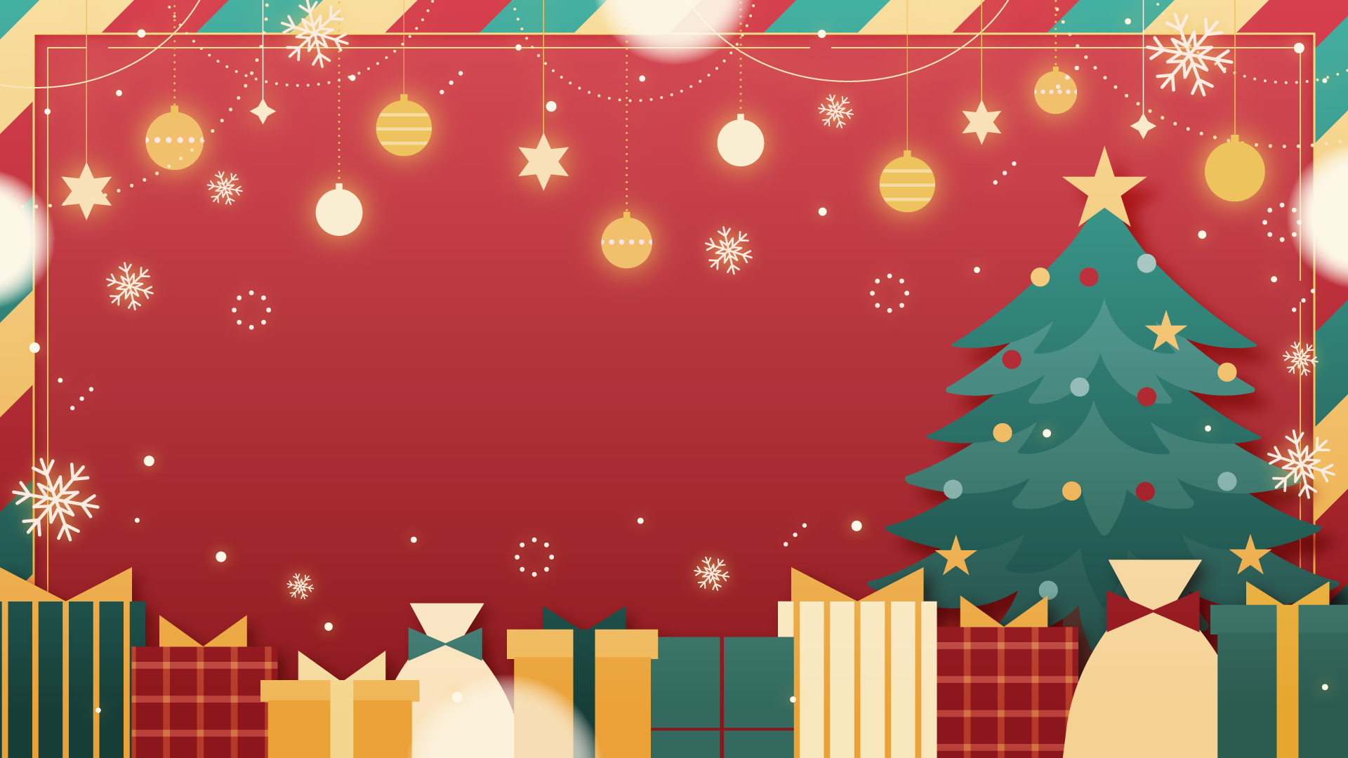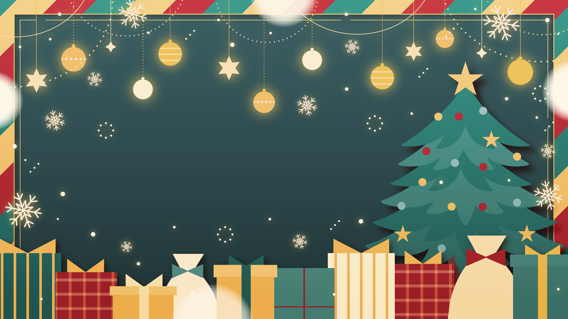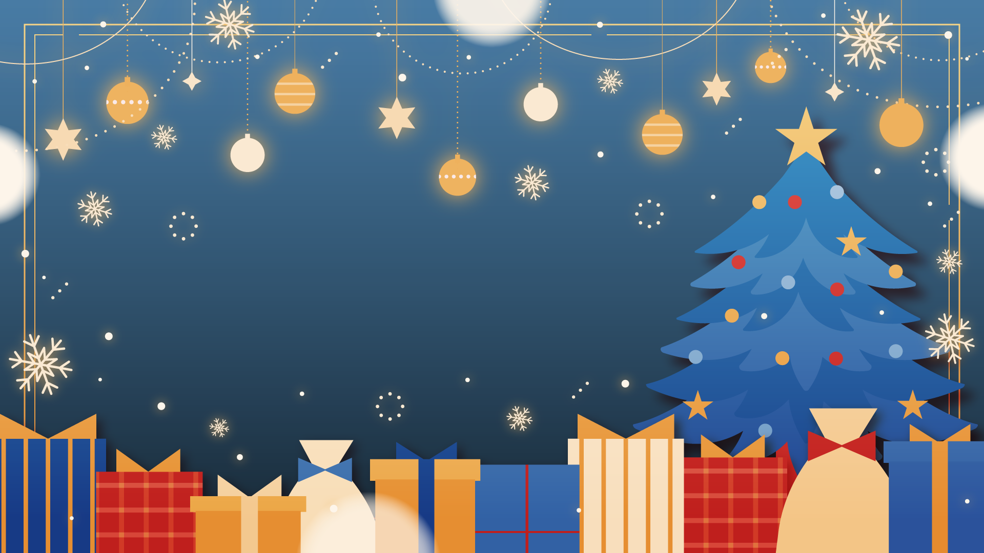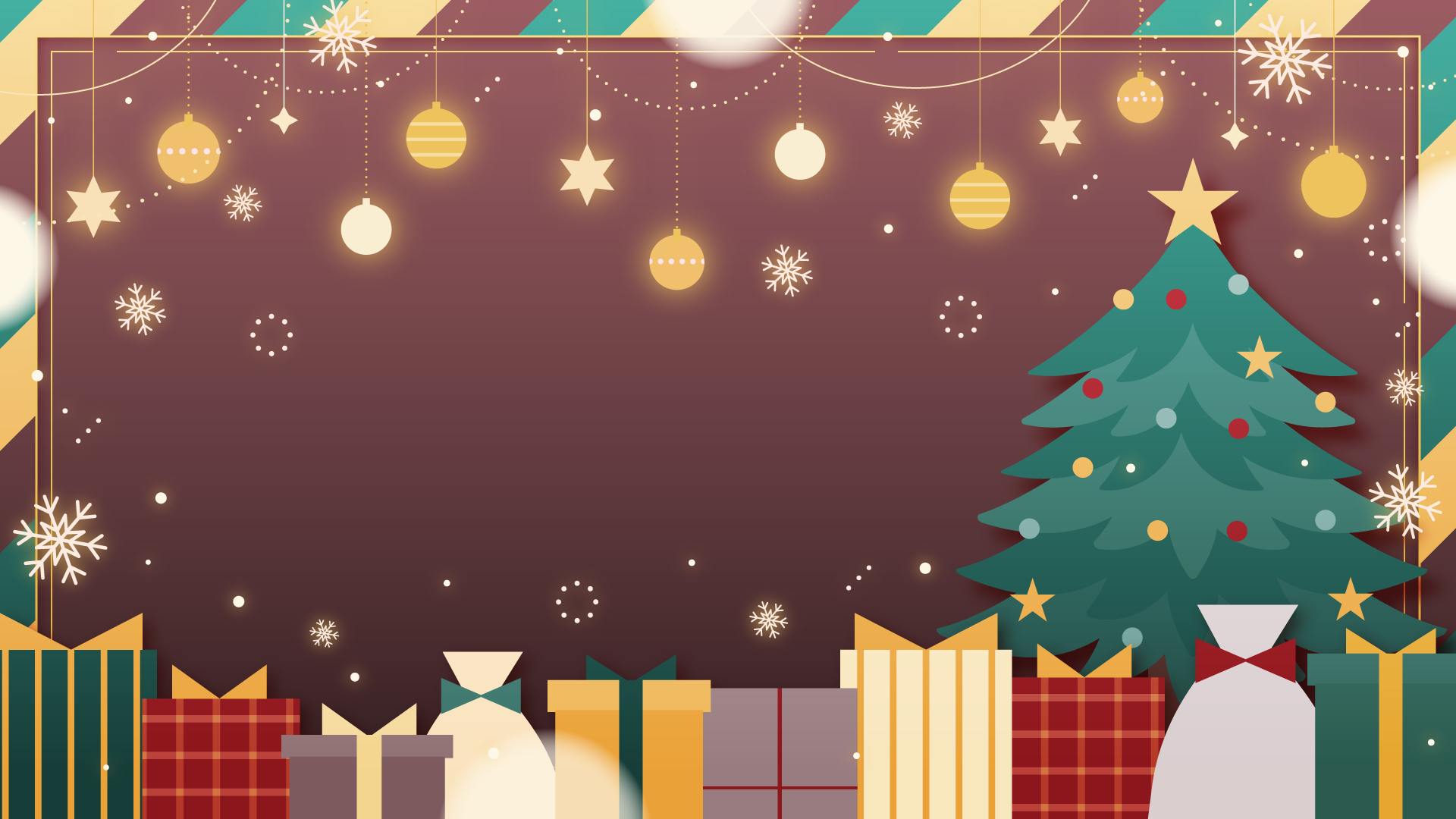 オーナメントとクリスマスツリー、プレゼント、雪の結晶なイラスト背景素材です。