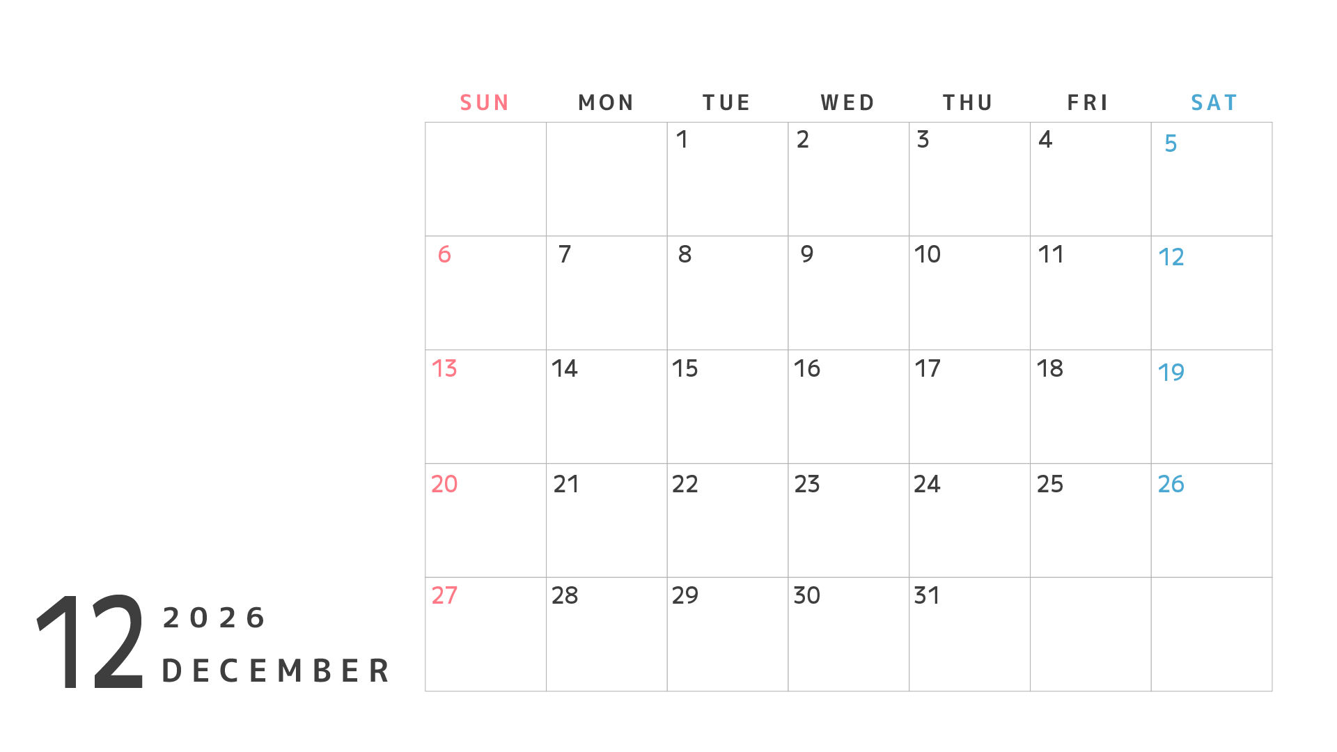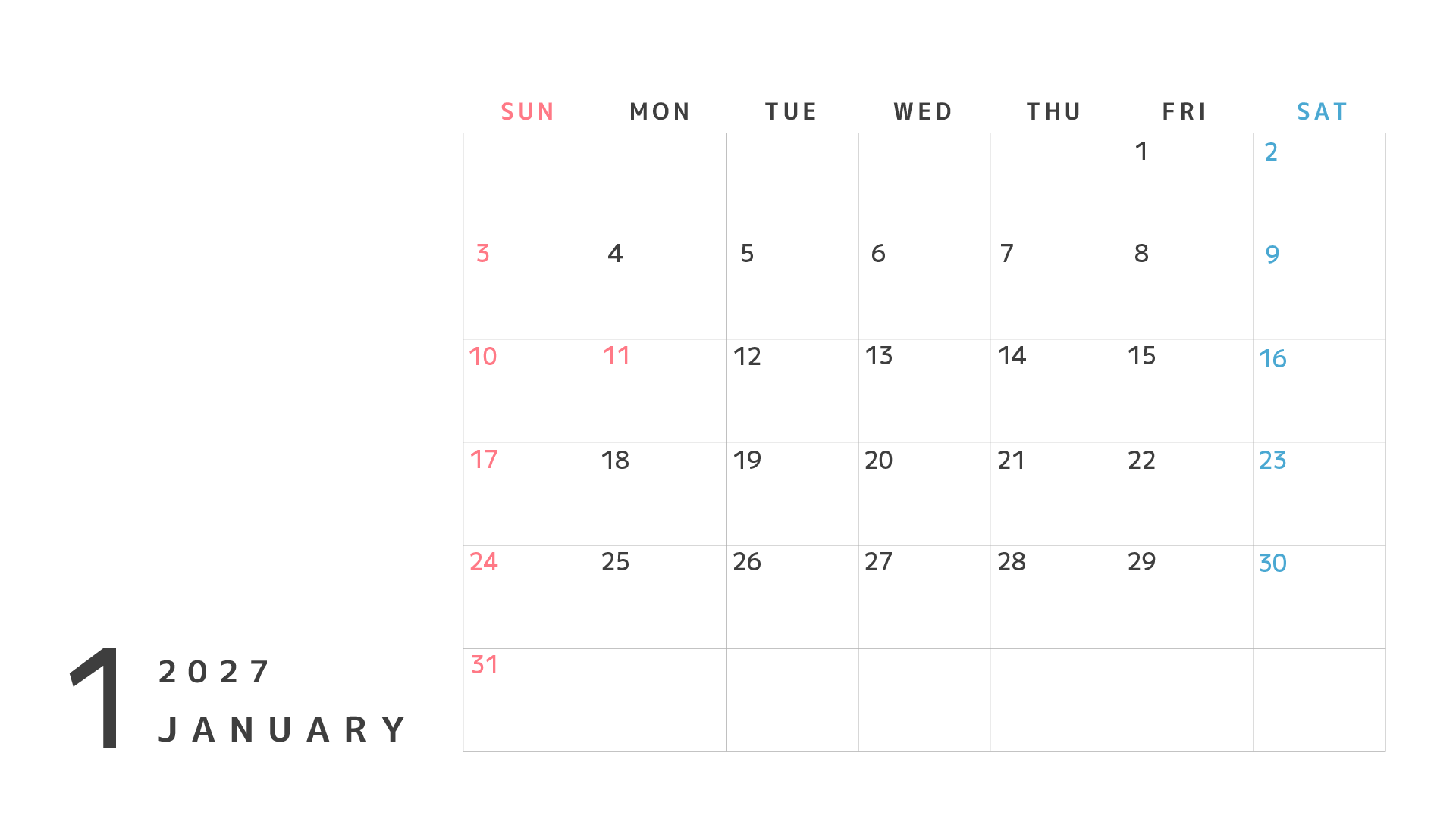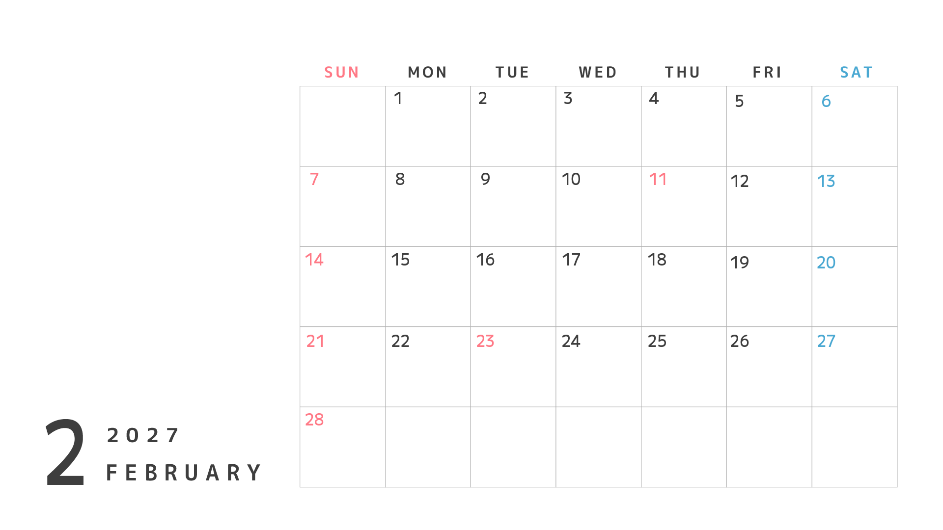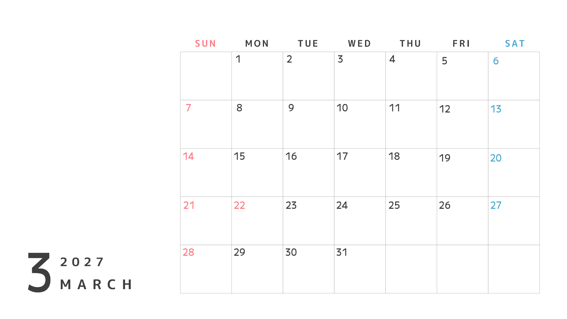 カレンダーのフリー素材です。2026年4月〜2027年3月まで。