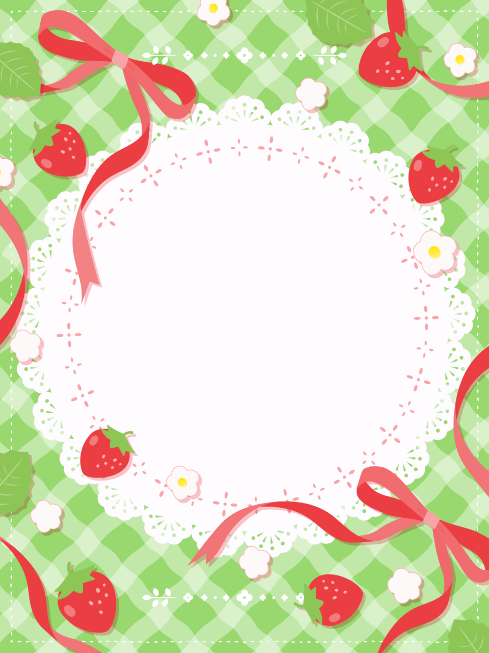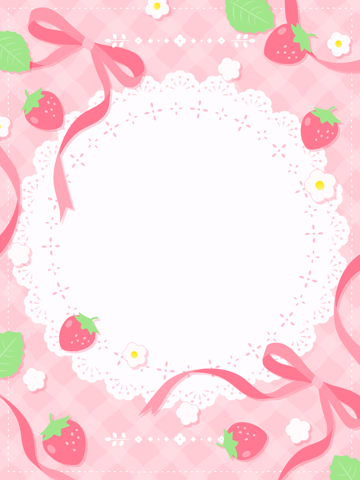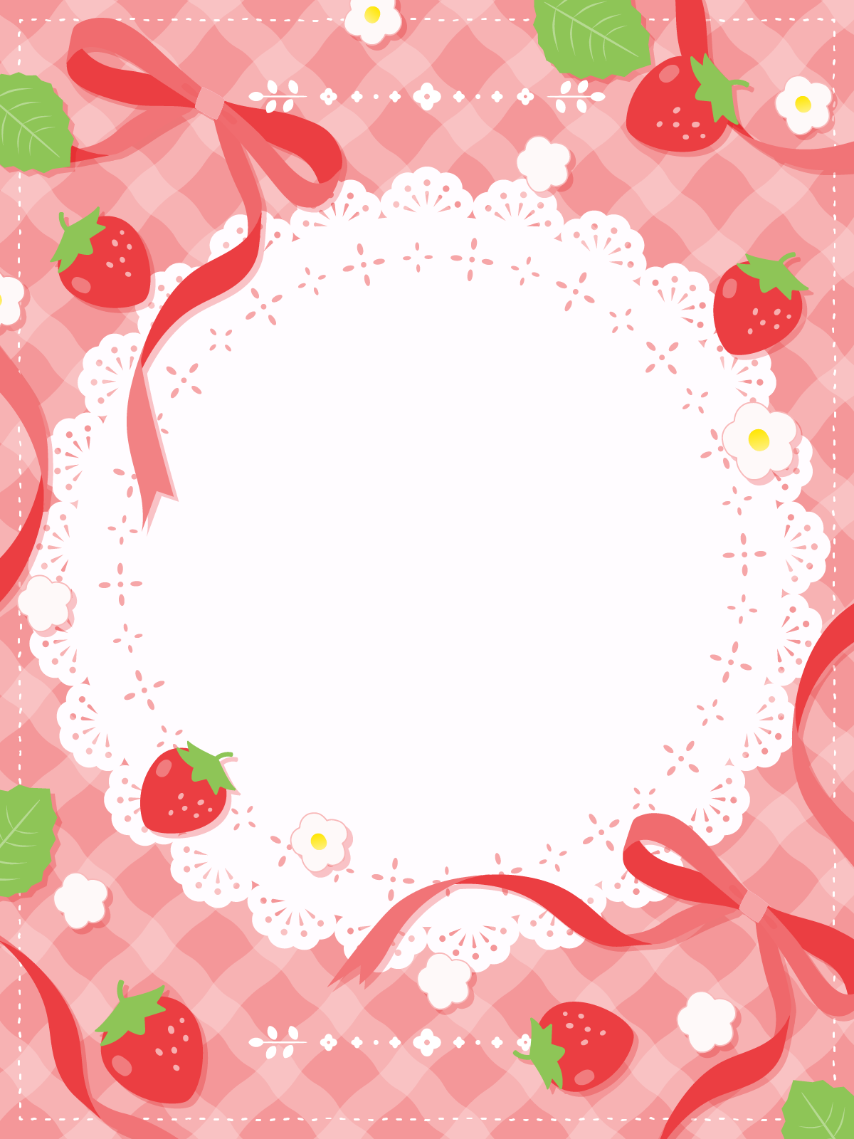 いちご、お花、リボンのかわいい背景素材です。フレームになっているのでイラストや文字を入れて使いやすい。春、いちご、食べ物、可愛い感じの画面作りにしたいときに...